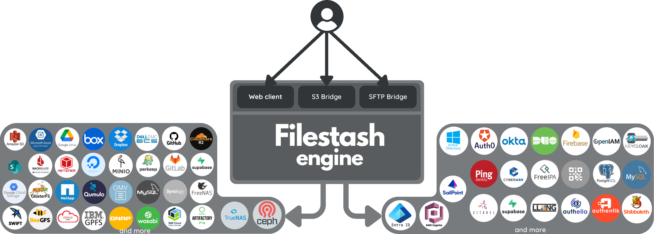 Effortlessly browse, organize, and share files across all your storage solutions via one intuitive interface with bridges to expose your data via SFTP or S3 for all underlying storage platform / protocol