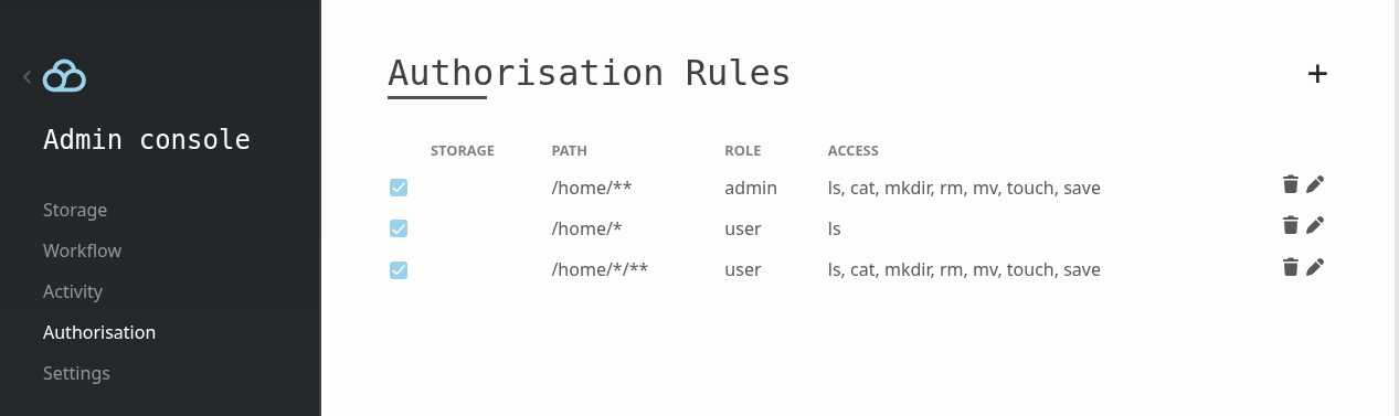A Filestash deployment has three components: storage, authentication, and authorisation. Storage is the “where”, authentication is the “who”, and authorisation is what links them together: the “… can do what …” that sits between identity and resource.