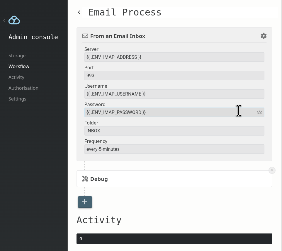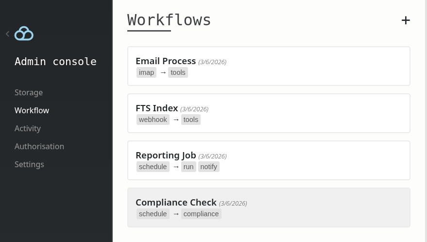 The trigger produces data, actions consume and transform it, each step feeding the next. To see the workflows you have set up, head to /admin/workflow: